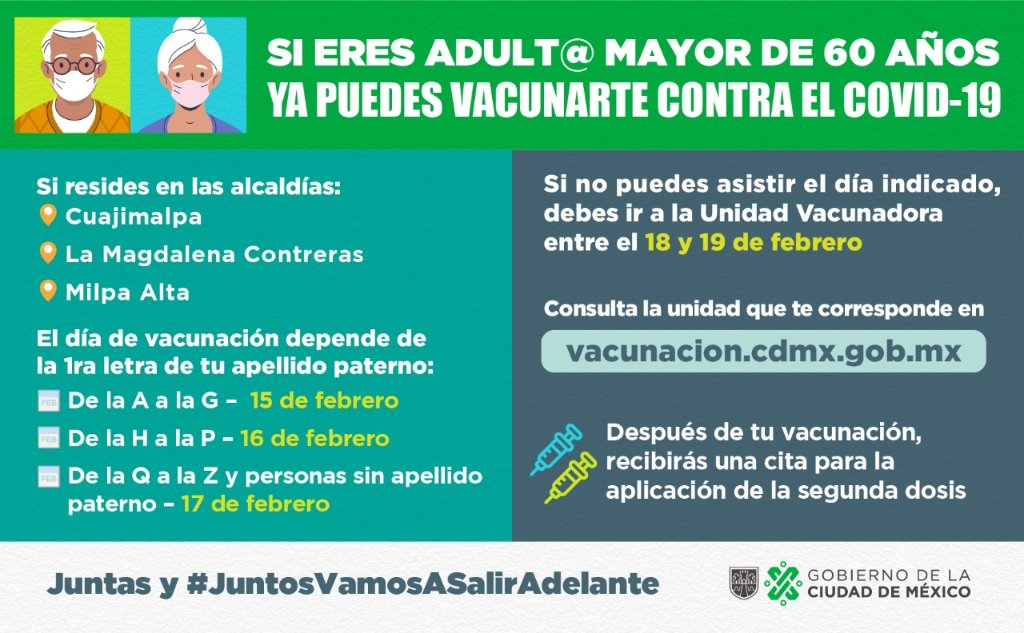 📢 ¡PASA LA VOZ! 📢 La primera etapa de vacunación para personas adultas mayores, arrancó el 15 de febrero en las las alcaldías CUAJIMALPA, MAGDALENA CONTRERAS y MILPA ALTA de la CDMX.