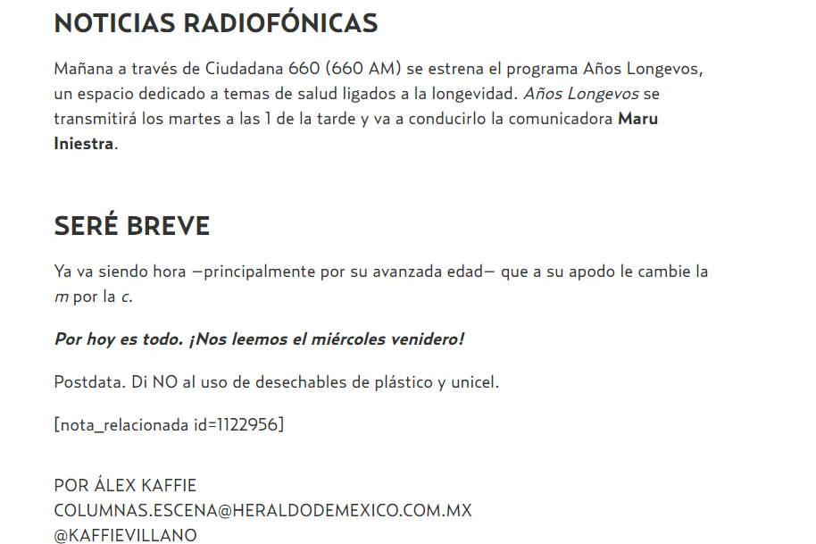 Agradecemos a Alex Kaffie que haya mencionado en su columna «Sin lisonja», del Heraldo de México, del 6 de julio del 2020, nuestro debut radiofónico en Ciudadana 660AM; estación del Instituto Mexicano de la Radio (IMER)