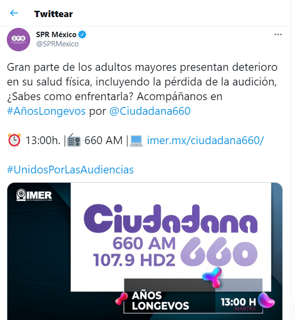 Agradecemos al Sistema Público de Radiodifusión del Estado Mexicano que haya mencionado en su programación, del 14 de julio del 2020, nuestro espacio sobre «Demencia» a través de Ciudadana 660AM; estación del Instituto Mexicano de la Radio (IMER)