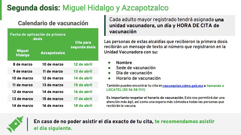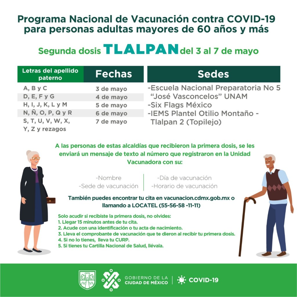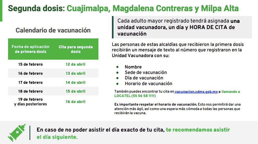 ¡CUAJIMALPA, MAGDALENA CONTRERAS Y MILPA ALTA ya les toca de nuevo! Acá les compartimos el esquema para la 2a dosis de vacunación en la Ciudad de México, para personas adultas mayores de 60 años y más.
