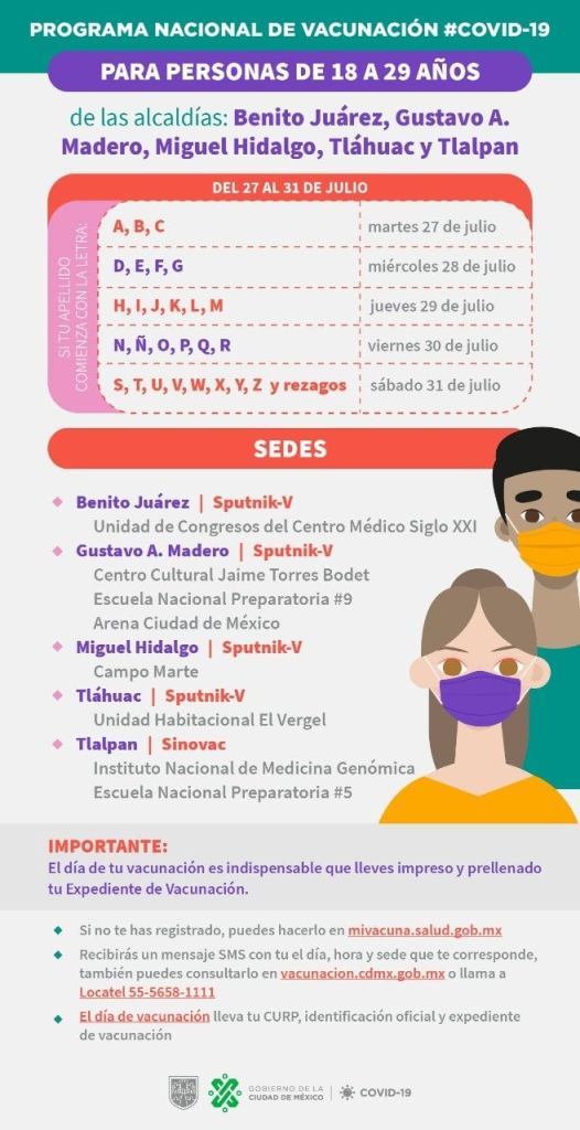 Del 27 al 31 de julio se aplicará la 1era DOSIS para PERSONAS DE 18 a 29 años en BENITO JUÁREZ, GUSTAVO A. MADERO, MIGUEL HIDALGO, TLÁHUAC y TLALPAN.