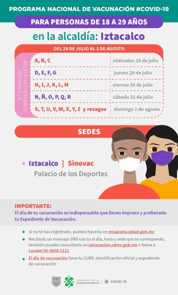 Del 28 de julio al 1 de agosto se aplicará la 1era DOSIS para PERSONAS DE 18 a 29 años en IZTACALCO