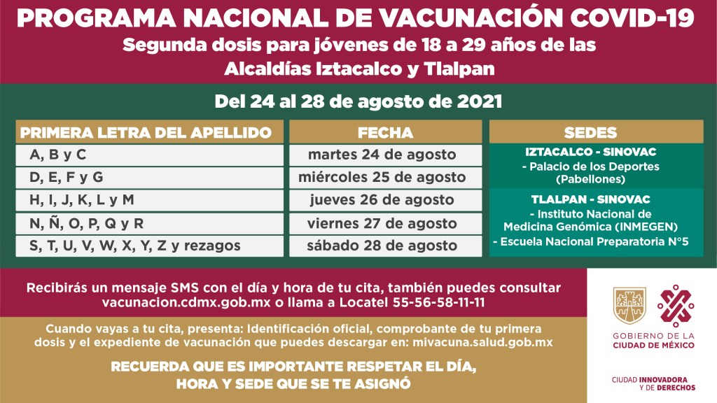 Del 24 al 28 de agosto se aplicará la 2a DOSIS para PERSONAS DE 18 a 29 años en IZTACALCO Y TLALPAN.