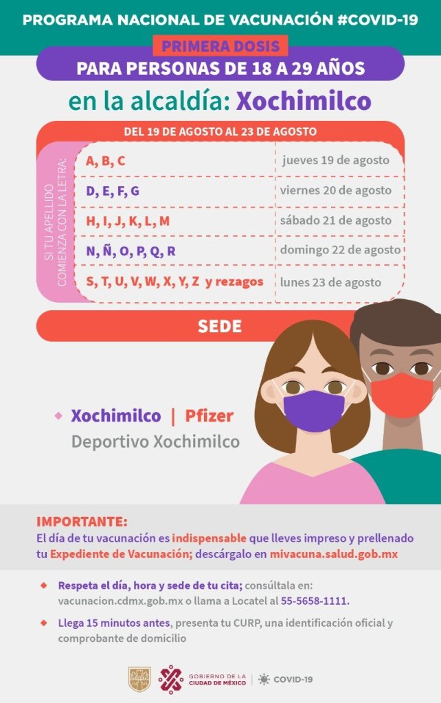 ¡Cuidador@s en CDMX! Del 19 al 23 de agosto se aplicará la 1era DOSIS para PERSONAS DE 18 a 29 años en XOCHIMILCO. – Debes llevar tu expediente de vacunación, el cual puedes descargar en: mivacuna.salud.gob.mx