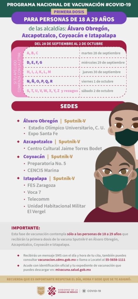 Del 28 de septiembre al 2 de octubre se aplicará la 1a dosis para personas de 18 A 29 AÑOS en ÁLVARO OBREGÓN, AZCAPOTZALCO, COYOACÁN E IZTAPALAPA.