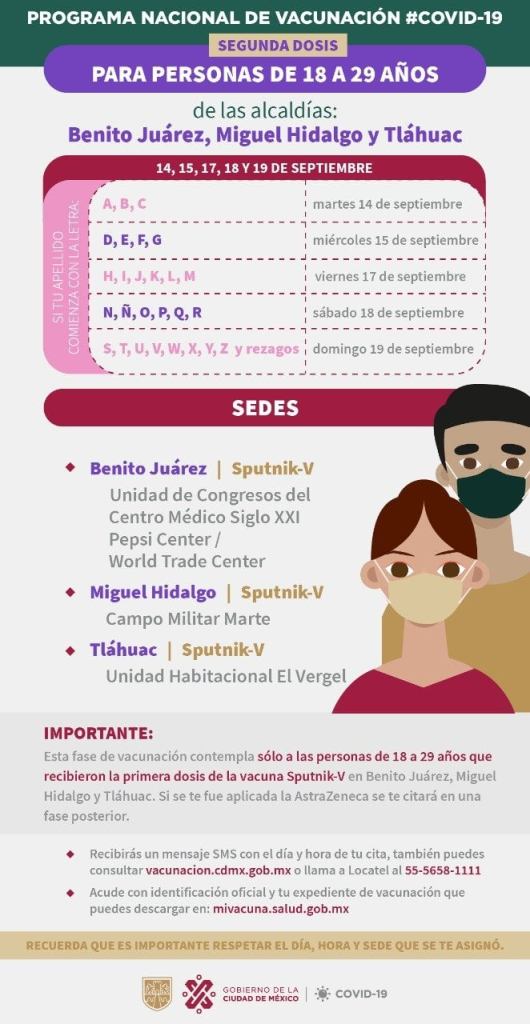 Del 14 al 19 de septiembre se aplicará la 2a DOSIS para PERSONAS DE 18 a 29 años en BENITO JUÁREZ, MIGUEL HIDALGO Y TLÁHUAC.