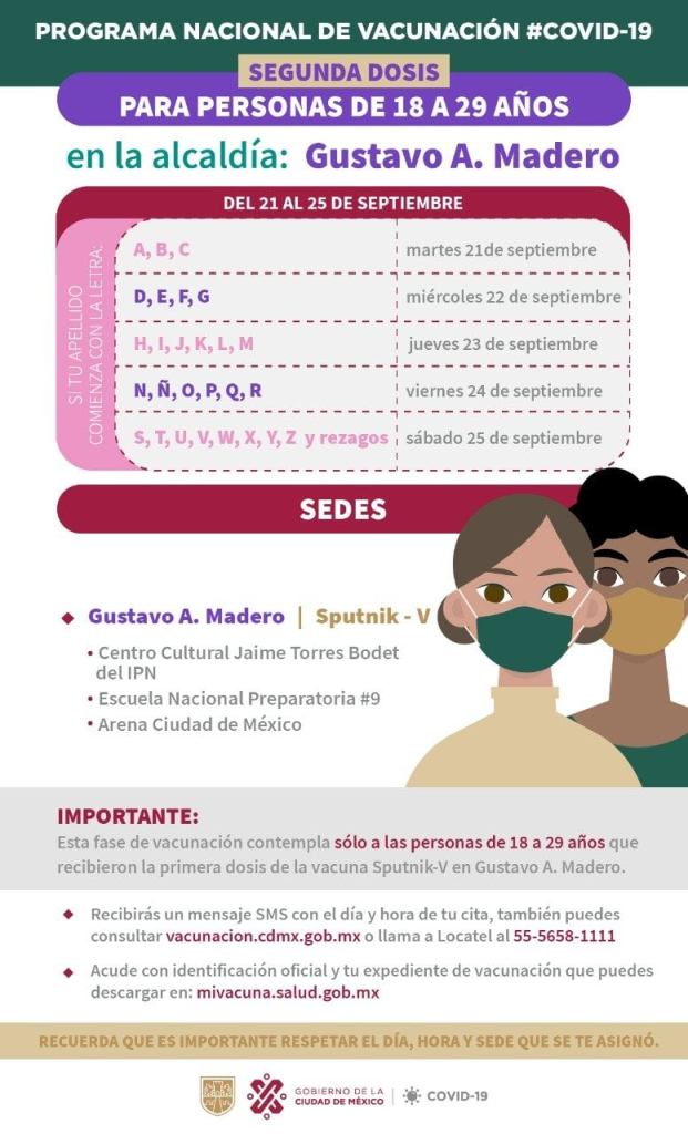 Del 21 al 25 de septiembre se aplicará la 2a dosis para personas de 18 A 29 AÑOS en GUSTAVO A. MADERO